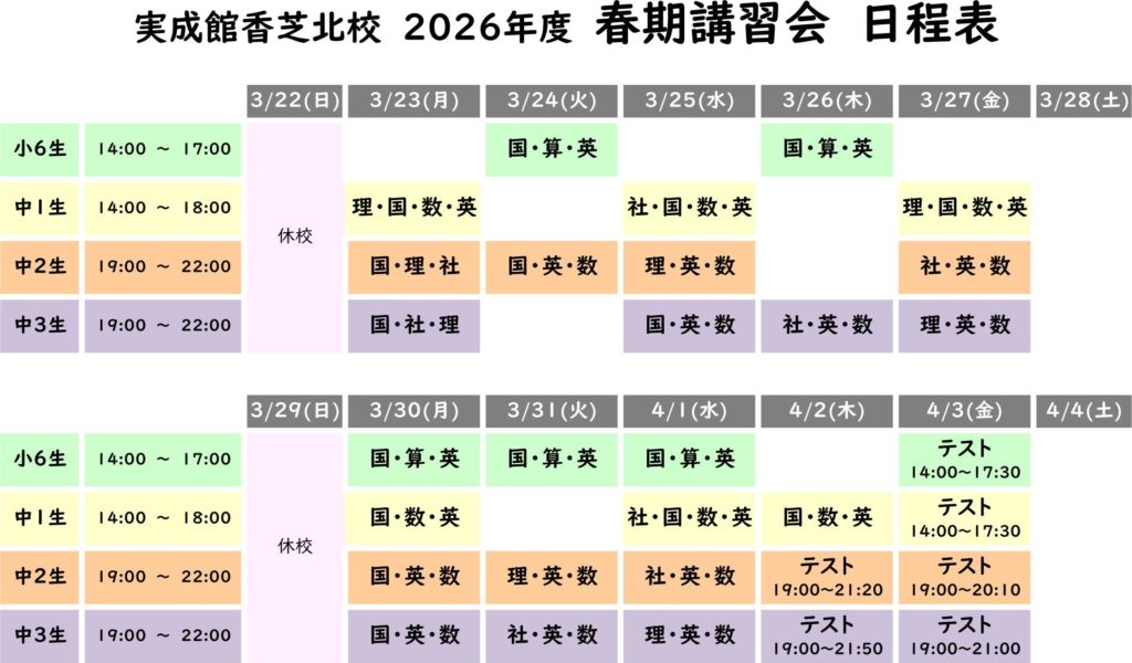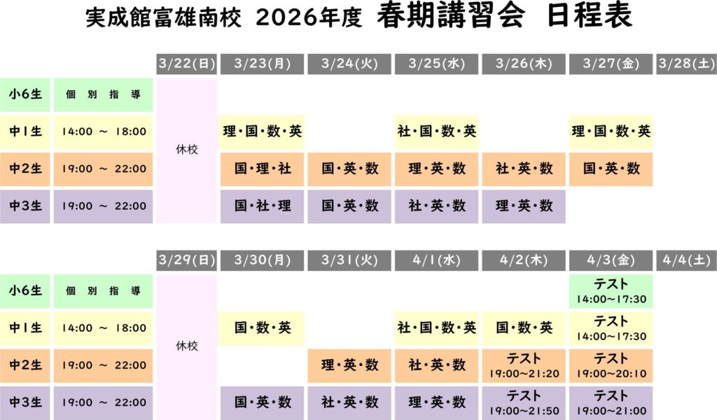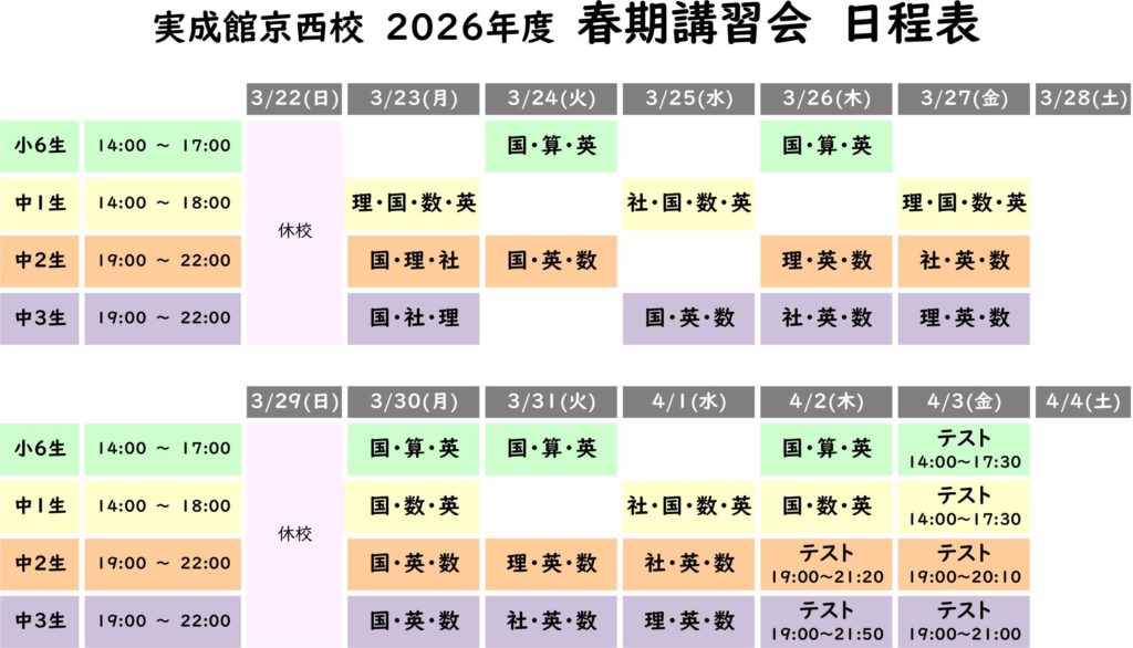 【時間割】春期講習 日程表をアップしました! 2026年2月27日 最終更新日時 : 2026年2月27日 実成館スタッフ 【実成館】春期講習日程表、【アップ学習会】春期個別授業時間割をアップしました。 【実成館 京西校】春期講習日程表 【実成館 富雄南校】春期講習日程表 【実成館 香芝北校】春期講習日程表 【アップ学習会】春期個別授業時間割 春期講習の受講料はこちら お問い合わせはこちら