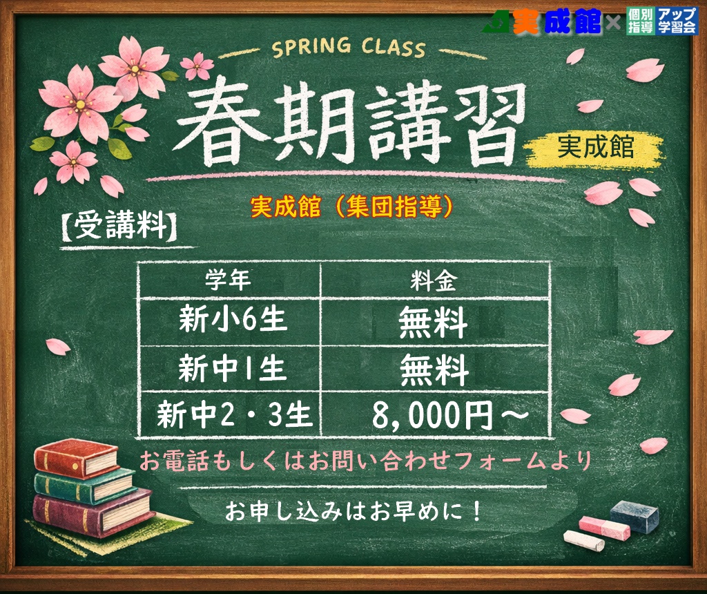 【春期講習】お得なお知らせ 2026年2月27日 最終更新日時 : 2026年4月13日 実成館スタッフ 春期講習の受講料は今だけのお得な入会キャンペーン適用価格でご案内しています。 実成館(集団指導) アップ学習会(個別指導) お問い合わせはこちら